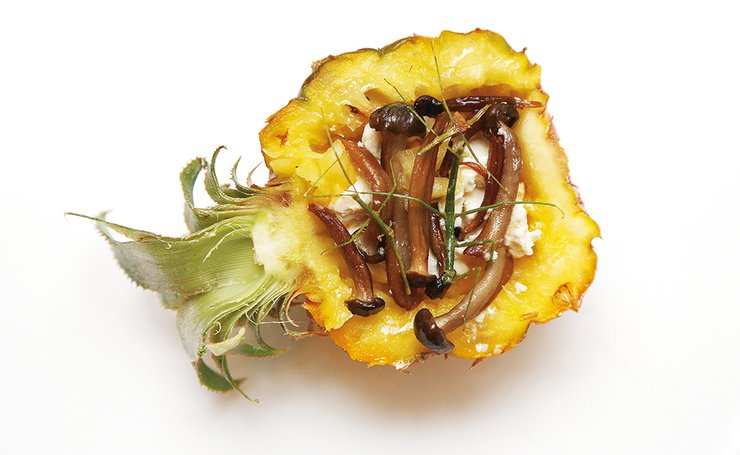 Завтрак аристократа. Салат из мягкого сыра с палочниками и лесными грибами в ананасе