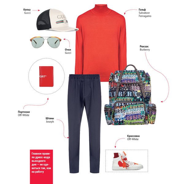 Для одежды на выходные тоже есть дресс-код. Главное его правило заключается в том, чтобы не одеваться так, как на работу. Можно позволить себе яркие цвета, смелые сочетания и околоспортивную удобную одежду, которая давно стала привычной для города. Mast have этого сезона — водолазка. Удобная, практичная и красивая, она вернулась в топ модной одежды из забытья, в котором пребывала долгие годы, если не десятилетия. Внезапно все заметили, как же ее не хватало. Подобрать к ней ансамбль легко: удобные брюки из эластичной ткани, которые балансируют на грани между спортивными и повседневными (по удобству — первые, на вид — вторые), городские кроссовки, рюкзак (наконец-то рюкзак, а не папка для бумаг или портфель) и, конечно же, очки с кепкой. Этот практически универсальный набор одежды идеально подходит как для исследования городских джунглей, так и для посещения любимых кафешек в округе.