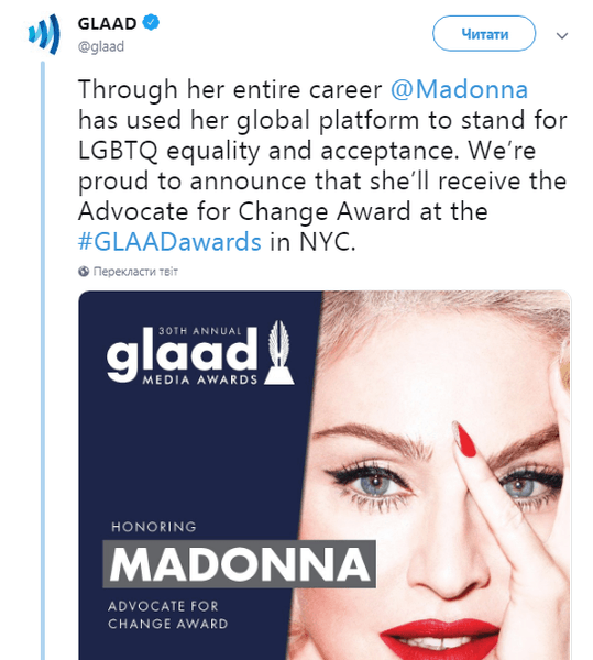 ЛГБТ-организация GLAAD (США) официально объявила, что знаменитая Мадонна будет награждена почетной премией "За призыв к переменам".
