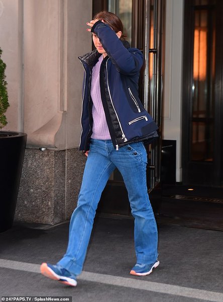 Актриса была одета в объемный лавандовый свитер, джинсы, темно-синюю куртку и кроссовки.