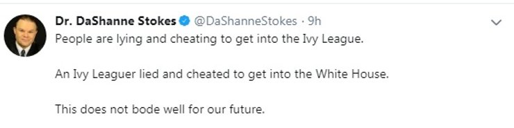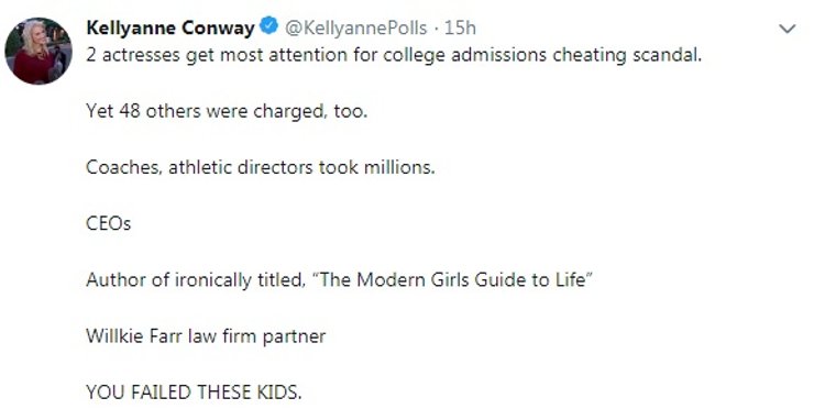 Перевод: все внимание приковано к двум актрисам, дававшим взятки, еще замешаны 48 человек. Тренеры, директора команд, которые брали миллионы, генеральные директора, автор книги с ироничным названием "Гайд по жизни для современных девушек", партнер в юридической фирме... вы все подвели этих детей!