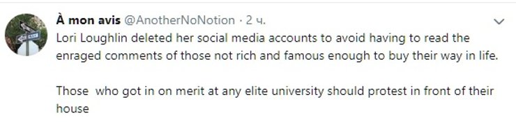 Перевод: Лори Лафлин удалила свои страницы из соцсетей, чтобы не читать комментарии тех, кто не богат и не знаменит, чтобы покупать себе жизненный путь. Вы, все кто честно поступил в элитный университет, должны протестовать у ее дома.