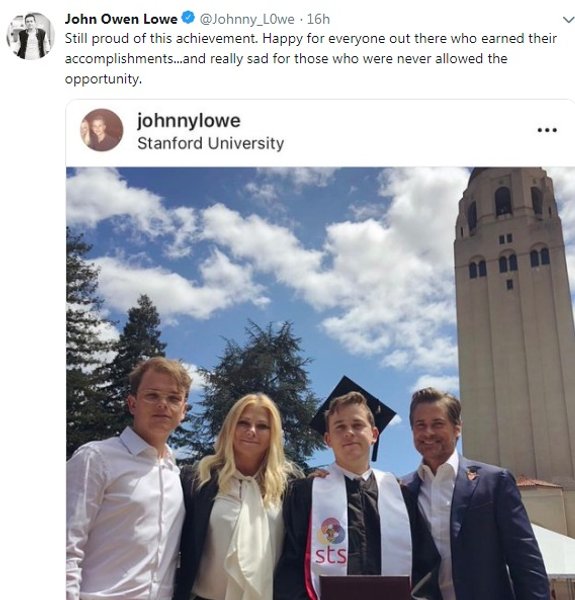 Так, сын актера Роба Лоу, честно закончивший престижный Стэнфорд с отличием, заявил, что гордится своим достижением и прекрасно помнит, как не спал ночами и готовился к экзаменам, чтобы поступить.