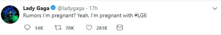 Певица Леди Гага прокомментировала слухи о своей беременности, которые стали с заметным упорством появляться в соцсетях и модных изданиях. Она ответила сплетникам, что если и беременна, то только своим новым альбомом. Соответствующий пост она написала в Twitter.