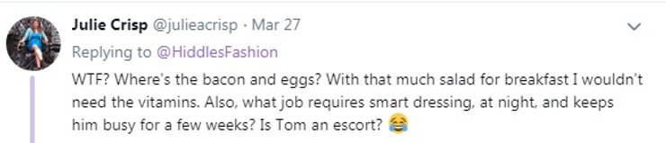 Перевод: что? А где яйца и бекон? И с таким количеством салата на завтрак витамины мне уже не нужны. И что это за работа требует так стилько одеваться, пропадать ночами и быть занятым неделями? Том работает в эскорте?