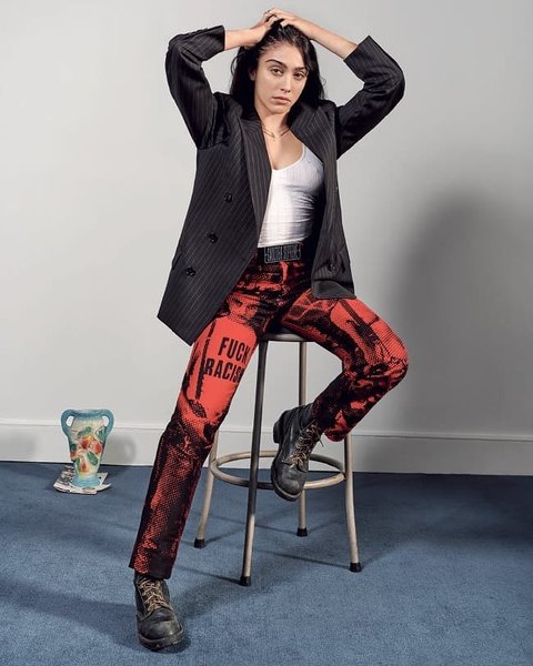 22-летняя Лурдес Леон предстала в весьма скромном образе, если сравнивать с матерью. На ней надета белая майка без бюстгальтера, свободный пиджак, кирпичного цвета брюки, на которых видно изображение скинхеда, облаченного в футболку с кричащей надписью и грубые ботинки.