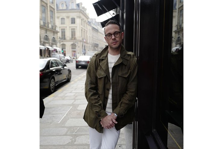 Журналист Брайан Сакава на своем примере демонстрирует, как можно удачно сочетать ветровку милитари с джемпером и брюками-чинос светлых оттенков. К слову, такая эклектичная эстетика в мужской моде сезона – еще один узнаваемый код и неотъемлемая составляющая большинства коллекций ведущих домов.