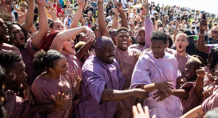 Тогда Канье устроил богослужение 21 апреля. Явился он на него с женой, Ким Кардашьян и с детьми, а также с целой группой людей в одинаковых сиреневых балахонах, и устроил перформанс в хиппи-стилистике.