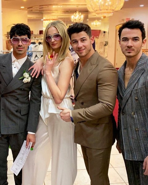 Софи и Джо поженились в Маленькой Белой Часовне в Лас-Вегасе. На Софи был белый комбинезон от украинского бренда Bevza, жених надел темно-серый двубортный костюм. Церемонию вел двойник Элвиса Пресли, а после пара позировала на розовом кадиллаке.