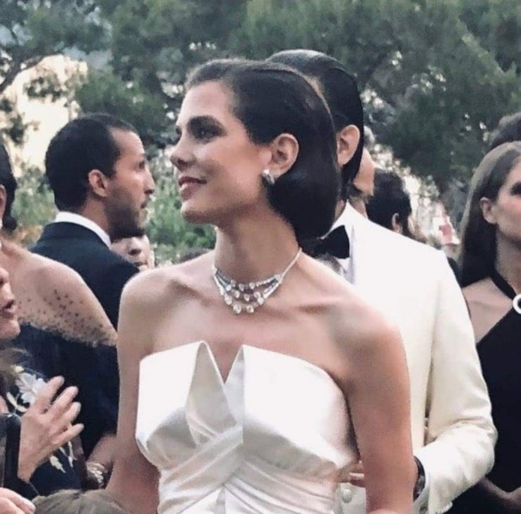 На снимке Шарлотта позирует в обществе супруга в платье модного дома Chanel и колье Cartier, заимствованном из коллекции ее легендарной бабушки.