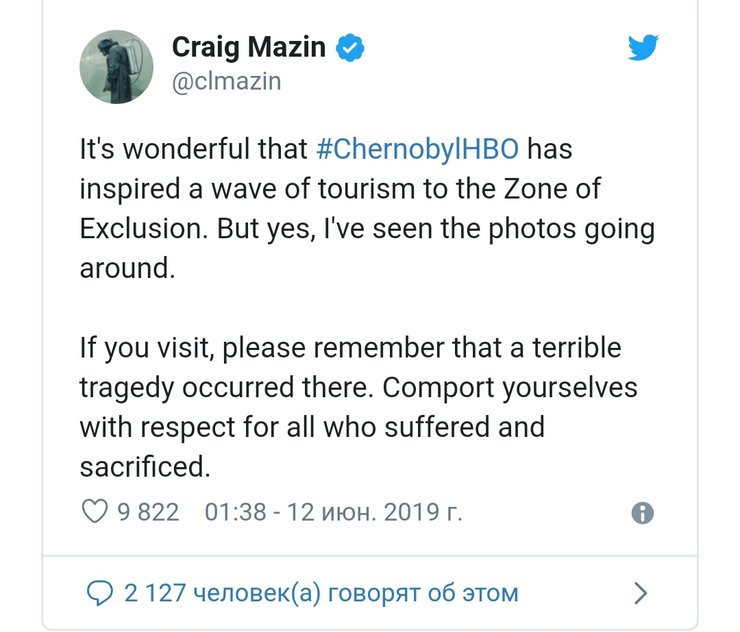 "Радует, что сериал "Чернобыль"поднял волну туризма в зону отчуждения. Но я видел, какие снимки публикуют из зоны отчуждения. Если вы турист, прошу лишь помнить, что в этом месте произошла страшная трагедия. Относитесь с уважением к жертвам и пострадавшим", - написал Крейг Мазин.