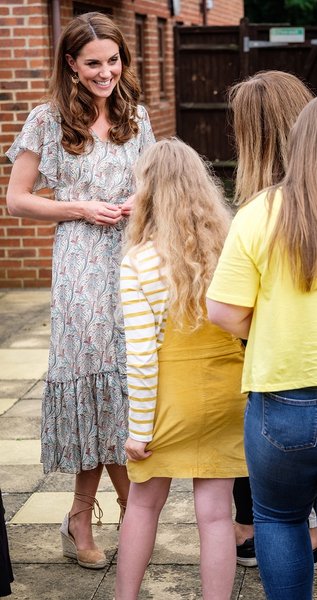 На мастер-классе Миддлтон появилась в романтичном образе: на ней было легкое платье с принтом пейсли от Ridley London за 449 фунтов и светло-бежевые эспадрильи на танкетке от бренда Castaner за 90 фунтов. Образ Кейт дополняли изящные серьги от Catherine Zoraid.