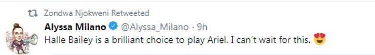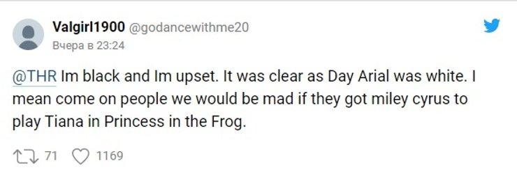 Перевод: "Я темнокожая, но все равно разочарована. Для меня очевидно, что Ариэль — белая. Ну то есть серьезно, люди были бы в ярости, если бы Тиану в "Принцессе и лягушке" сыграла бы Майли Сайрус".