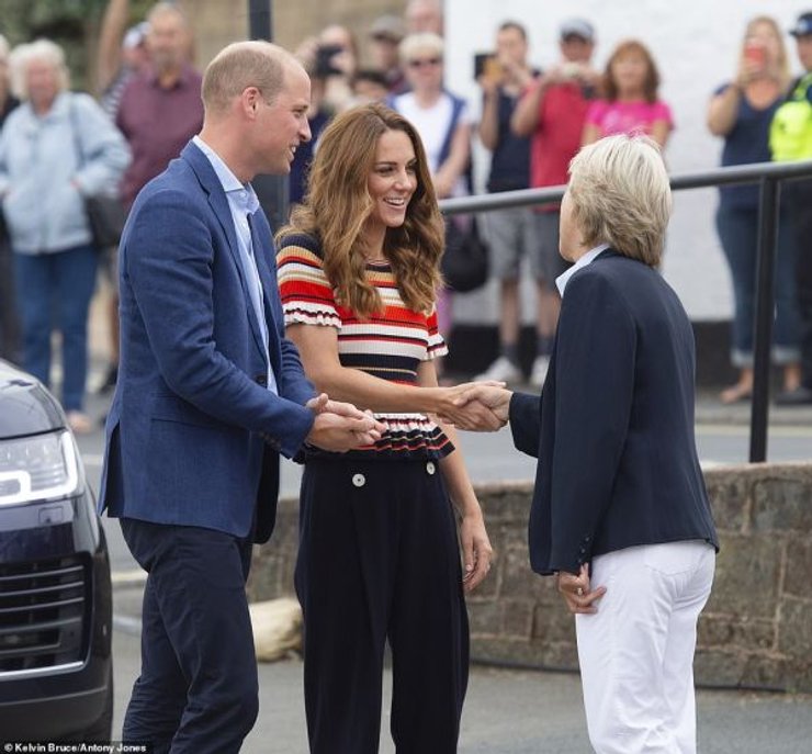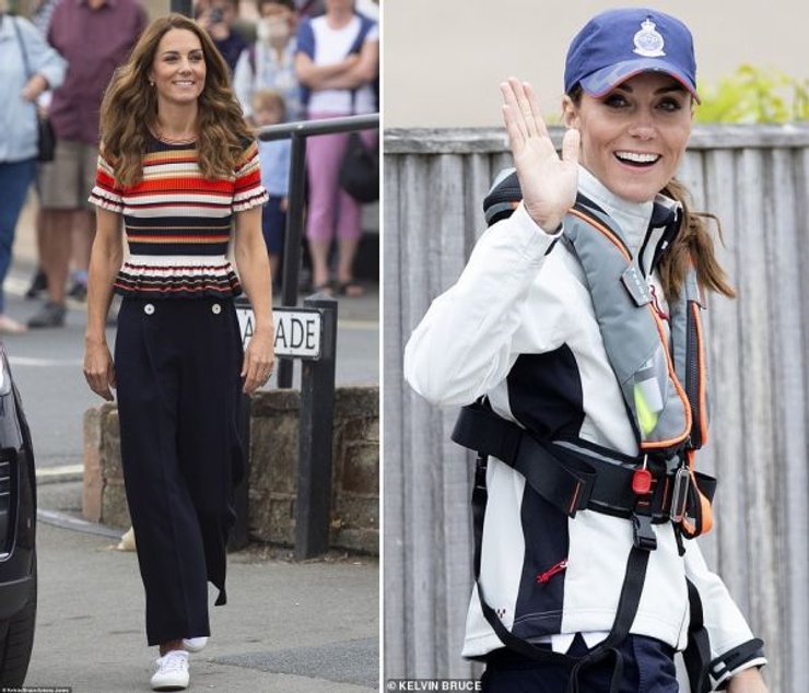 Кейт прибыла на регату в широких матросских брюках от L.K.Bennett и полосатом топе от Sandro. Но, прежде, чем взойти на борт яхты, она переоделась в спортивные шорты и поло.