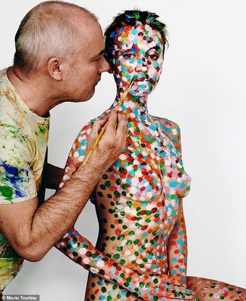 54-летний Дэмиен покрыл тело 26-летней Софи Каннелл множеством цветных мазков. Запечатлел процесс известный фотограф Марио Тестино.