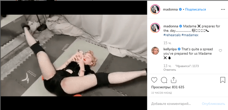 Легендарная Мадонна в своем Instagram показала, что в свои 60 лет она сохраняет хорошую физическую форму. Певица выложила видео, в котором делает растяжку в чулках лежа на спине.