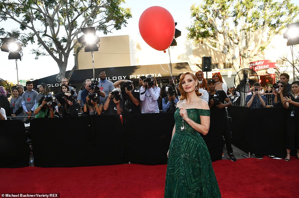 Для красной дорожки Джессика выбрала изумрудно-зеленое платье от Zuhair Murad и дополнила образ красным воздушным шариком. Именно с таким появляется в фильме клоун Пеннивайз.