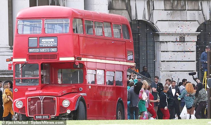 Также в кадре присутствовала танцующая толпа, изображающая гостей, королевские гвардейцы и двухэтажный красный автобус.
