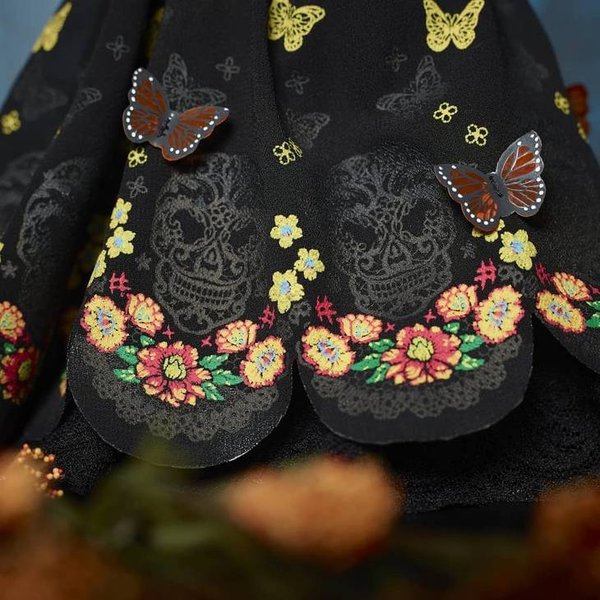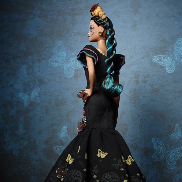 Коллекционная кукла будет стоить 75 долларов. На ее лицо нанесен традиционный макияж, изображающий стилизованный череп – Катрина Калавера. Платье украшено черепами и бабочками монархами. Они мигрируют в это время и символизируют души умерших.