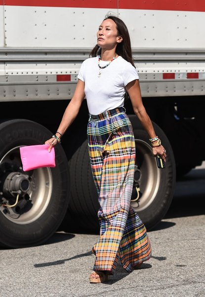 Нью-Йоркские модники не обделили вниманием и ключевые коды конца 60-х – начала 70-х годов. Образы в стиле Йоко Оно (платформа, широкие брюки, белая футболка, дополненная яркой бижутерией) неоднократно попадали в объективы фотографов . Изредка гости модных показов грешили отсылками к образам эпохи 40-х: широкие брюки, рукава, принт горох, платья миди и другие знаменитые коды военной эпохи массово появлялись на улицах модной столицы США.