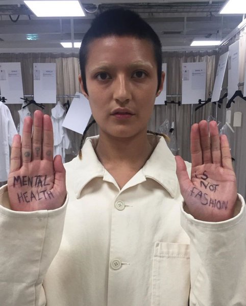Аэша написала на ладонях: "психическое здоровье – это не мода" и остановилась в конце подиума на несколько секунд, демонстрируя свой лозунг.