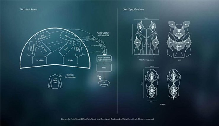 Чтобы обеспечить удобство для пользователя, толстовка изготовлена из специальных эластичных тканей, на ее поверхности размещены датчики передачи звука в соответствии с высотой тона разных музыкальных инструментов.