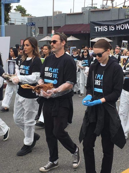 Хоакин Феникс придерживается веганства, а также не носит одежду и обувь из кожи и шерсти. Он и ранее выступал в защиту животных и принимал участие в демонстрациях.