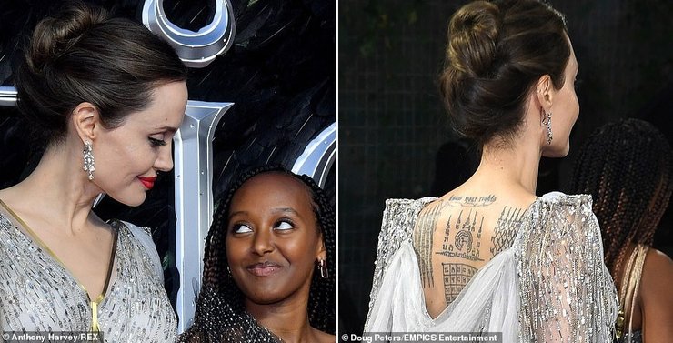 Для своего эффектного появления на красной дорожке Анджелина Джоли выбрала расшитое серебром платье со шлейфом, открывающее ее татуировки на спине.