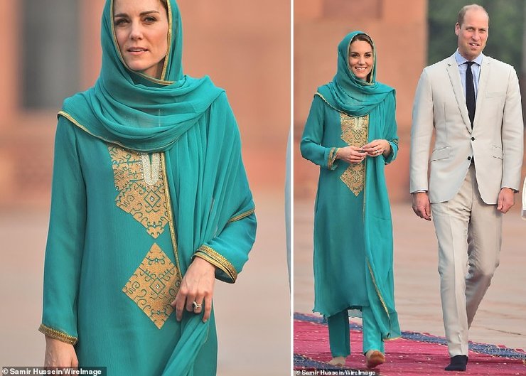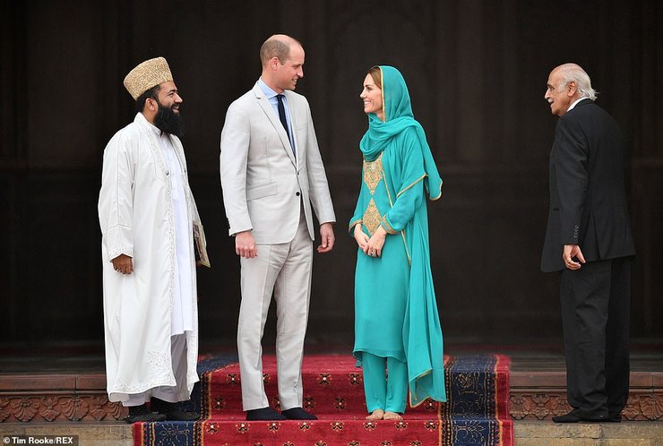 Для посещения исламской святыни герцогиня сменила наряд – одела национальный пакистанский наряд зеленого цвета, который так любим мусульманами.