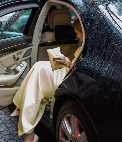 Автором желтого платья Елены Зеленской и фрака Владимира Зеленского выступил украинский дизайнер Иван Фролов (бренд FROLOV). Она дополнила свой образ короткими ажурными перчатками и атласными туфельками.