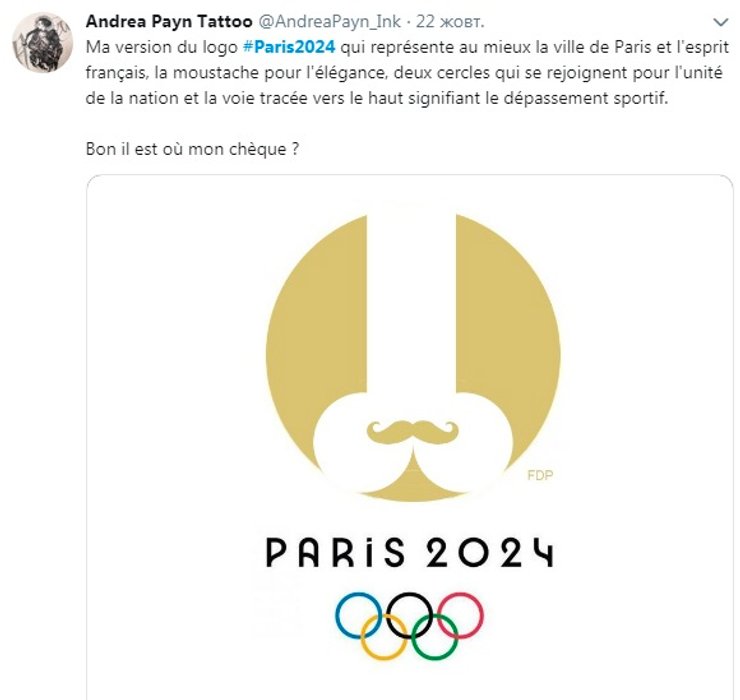 Перевод: моя версия логотипа для Олимпиады #Paris2024, которая лучше всего представляет город Париж и французский дух: усы для элегантности, два круга, которые объединяются для единства нации, и путь наверх, означающий стремление. Ну, где мой чек?