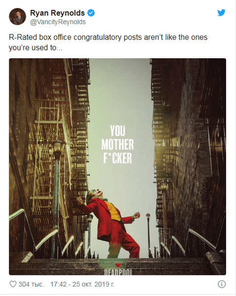 Ранее самым кассовым фильмом с взрослым рейтингом был "Дэдпул". Тогда, в 2016 году бокс-офис фильма о болтливом наемнике составлял 783 миллиона долларов. Райан Рейнольс, исполнивший главную роль в блокбастере уже поздравил Хоакина Феникса в присущем для себя стиле.