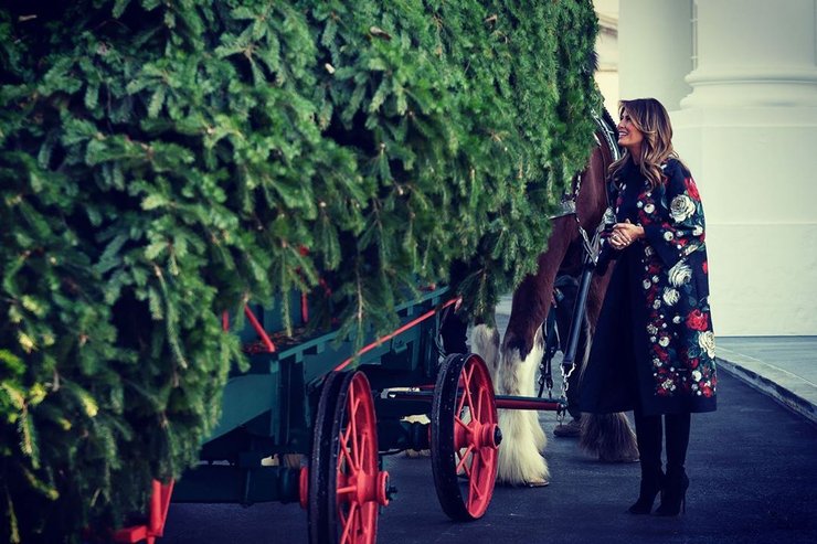 По традиции, елку доставили в Белый дом на повозке, запряженной лошадьми. Встречать дерево вышла Мелания Трамп. Для такого события она выбрала пальто с яркими аппликациями и замшевые сапоги на очень высоких каблуках. И лично пригласила семью Снайдер в Белый дом на Рождество.
