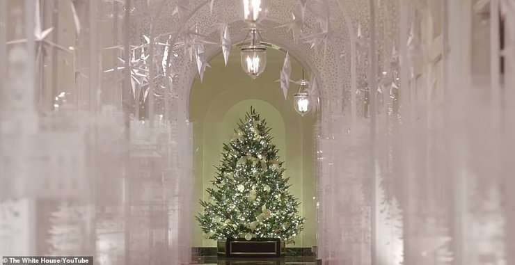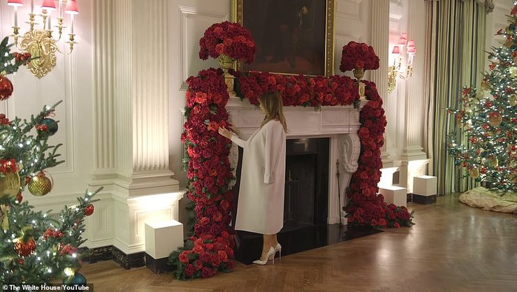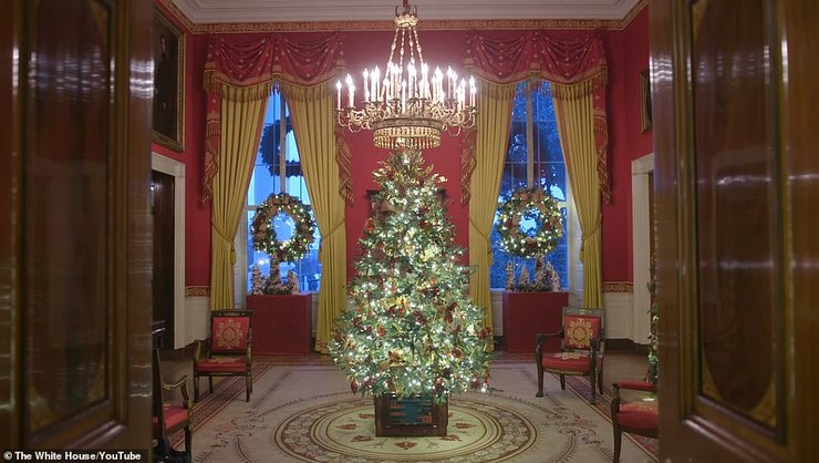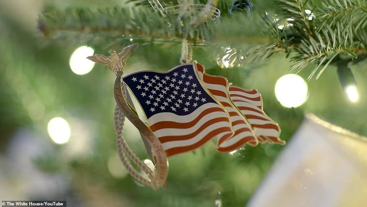 Также в Голубом зале Белого дома поставили патриотическую елочку, увенчанную золотым орлом и украшенную бантами в цветах американского флага. Камин декорировали гирляндами из алых роз, установили адвент-календарь в виде Белого дома, а одну из галерей украсили белыми звездами, свисающими с потолка.