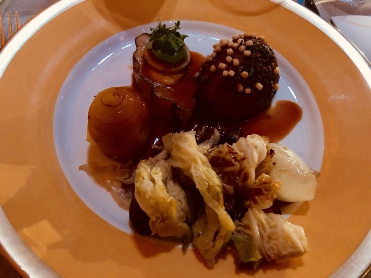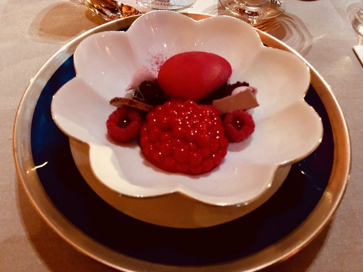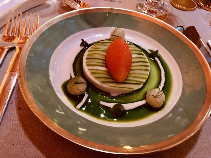 Меняющееся каждый год меню всегда представляет скандинавскую кухню, поэтому зачастую включает лосось, креветки и дичь. Одно известно точно: в этом году на десерт подавали малиновый сорбет с шоколадом.
