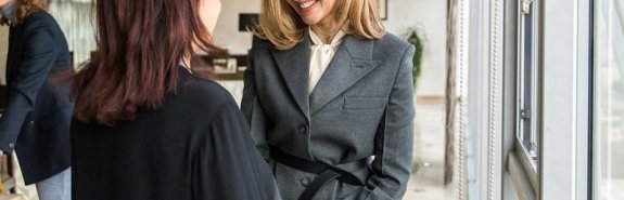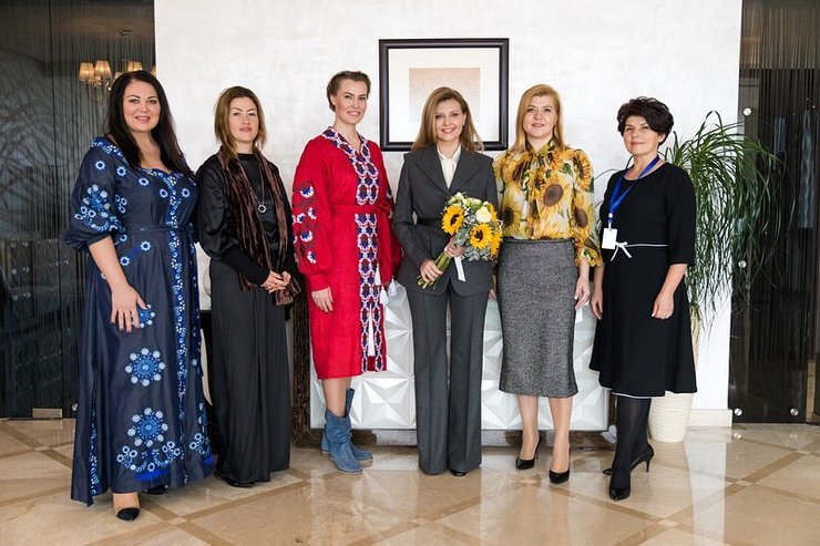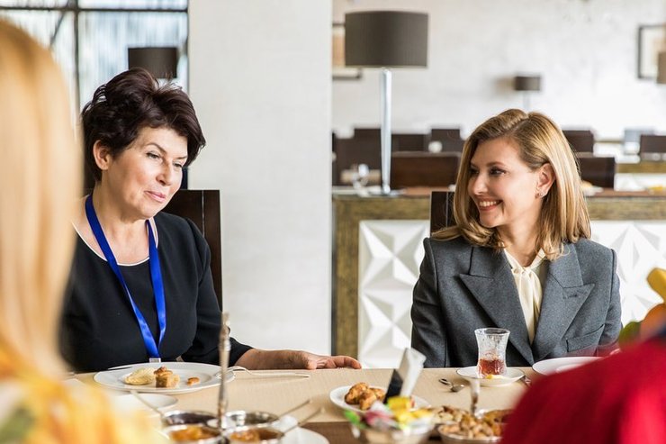 Далее, не меняя наряда, Зеленская отправилась на встречу с представительницами Украинского женского бизнес-клуба в Баку.