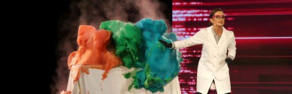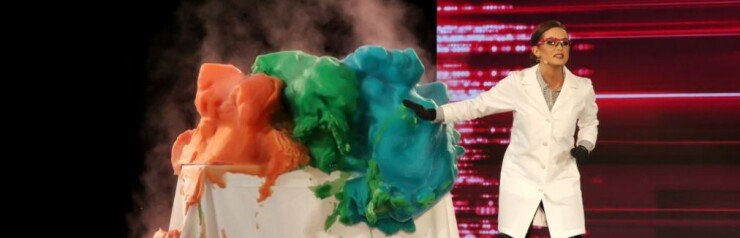 Девушка надела лабораторный халат и продемонстрировала судьям каталитическое разложение перекиси водорода.