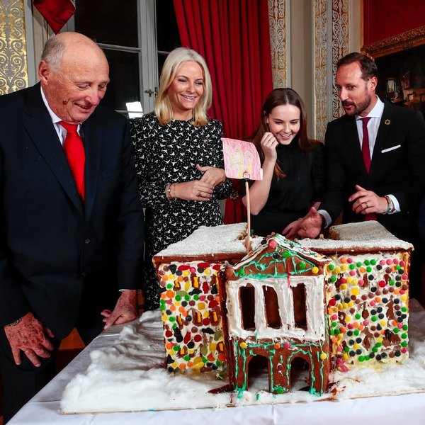 Король Норвегии с семьей для рождественского фото собрались в Красной гостиной дворца, и показали подарок от местных детей: пряничный домик.