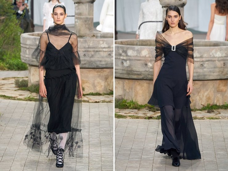 В коллекции практически отсутствуют брючные ансамбли. При этом большинство представленных нарядов так или иначе отсылают к одеяниям монахов-цистерцианцев. Открытые плечи моделей прикрыты пелеринами. А юбки – ниже колен, или чуть выше. Это реверанс самой Коко – она не любила мини, считая колени не самой привлекательной частью тела.