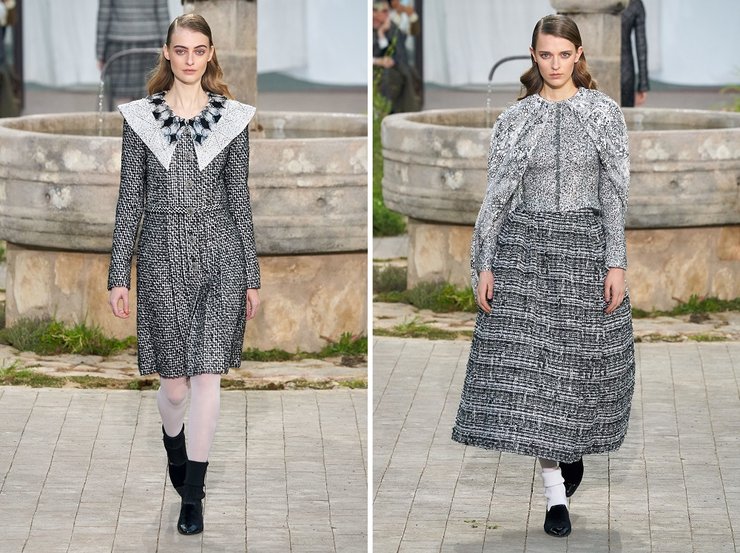 Показ открыли лаконичные пальто, знаковые для бренда твидовые костюмы и платья с белыми пелеринами в черно-белую клетку и гусиную лапку.