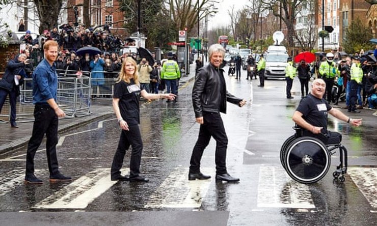 Принц Гарри, певец Джон Бон Джови и участники хора Invictus Games (международных мультидисциплинарных соревнований бывших и действующих военных, ставших инвалидами) повторили известное фото с обложки альбома Abbey Road группы The Beatles. Об этом сообщает Тhe Guardian.