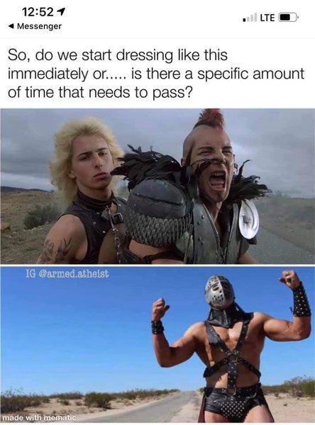 Перевод: а нам уже пора одеваться так (на фото кадры из постапокалиптического фильма "Безумный Макс"), или должно пройти еще немного времени?