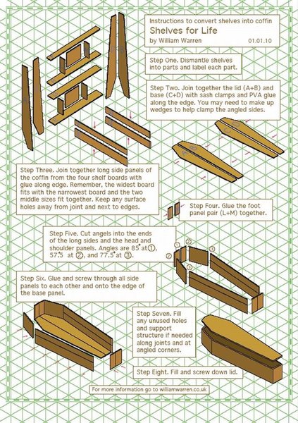 Британский дизайнер Уильям Уоррен придумал книжный шкаф-трансформер, из полок которого собирается гроб. Такой конструктор он назвал "Полки для жизни"