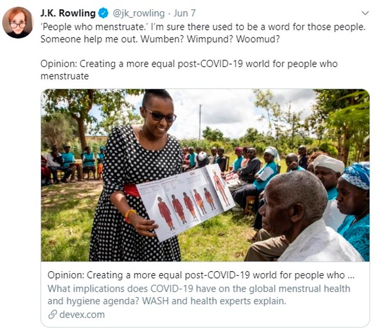 Речь идет о статье "Создание равноправного мира после COVID-19 для людей, которые менструируют", которая вышла на ресурсе Devex. В статье говорилось, что, по оценкам, у около 1,8 миллиарда девочек, женщин и небинарных людей есть менструация. Именно формулировка "люди, которые менструируют" и смутила 54-летнюю писательницу. Такое выражение используется в отношении трансмужчин, у которых, как и у женщин, бывает менструация.