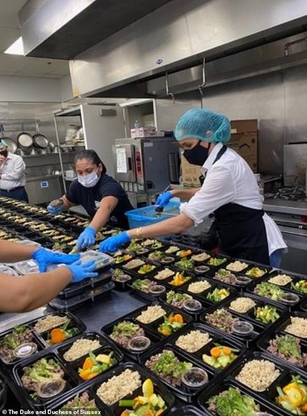 Принц и герцогиня надели маски и сеточки для волос и трудились наравне с остальными. Они замешивали и раскатывали тесто для булочек, а Меган поработала еще и на раздаче.