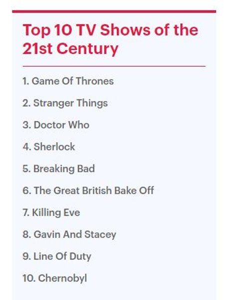 Лучшим телешоу 21-го века был признан фэнтези-сериал "Игра престолов". Следом в рейтинге зрительских симпатий идут "Очень странные дела", и "Доктор Кто" – на третьем месте.