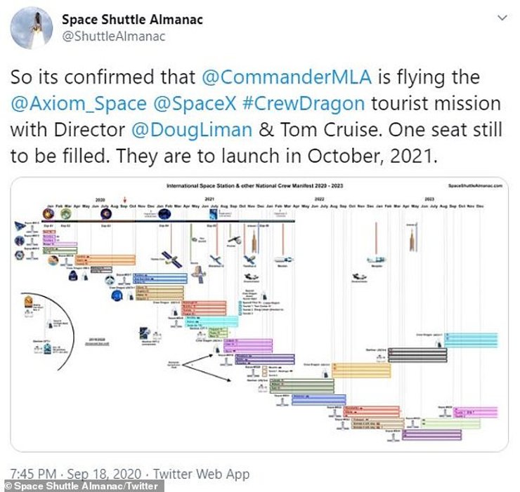 Кроме Круза на МКС отправится режиссер Дуг Лиман. Полет запланирован на октябрь 2021 года, пилотировать космический челнок SpaceX Crew Dragon будет NASA и ветеран-астронавт Майкл Лопес-Аллегрия. Кто займет еще одно свободное место – пока неизвестно.