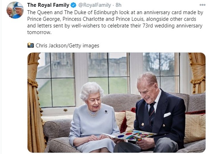 На фото 94-летняя Елизавета и 99-летний Филипп сидят на диване и рассматривают яркую самодельную открытку. Ее изготовили для них правнуки — дети принца Уильяма и Кейт Миддлтон. Семилетний принц Джордж, пятилетняя принцесса Шарлотта и двухлетний принц Луи украсили обложку большими цифрами — 73.