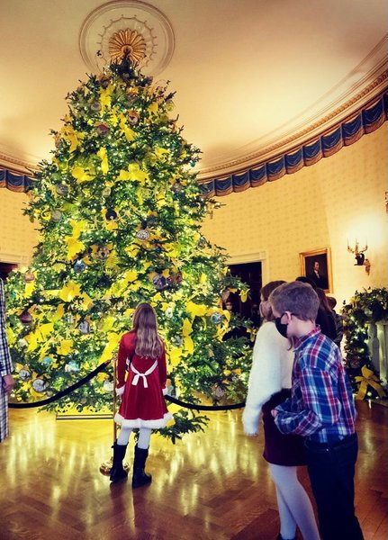 Напомним, в этом году первая леди обозначила тему декора Белого дома как "Прекрасная Америка", а на помощь в украшении холлов и залов пригласила волонтеров из всех штатов. На главной праздничной ели в Голубой комнате, которую в этом году доставил в резиденцию победитель ежегодного конкурса среди фермеров Дэн Тейлор, повесили самодельные игрушки — их авторами выступили дети из всех 50 штатов.