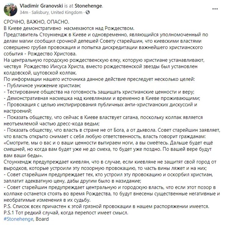 Один из главных аргументов – ставить елку в принципе – традиция христианская, а злополучная шляпа, которой так гордятся создатели, — атрибут нехристианский, а потому не место ему рядом с собором, в Киеве и вообще в Украине.